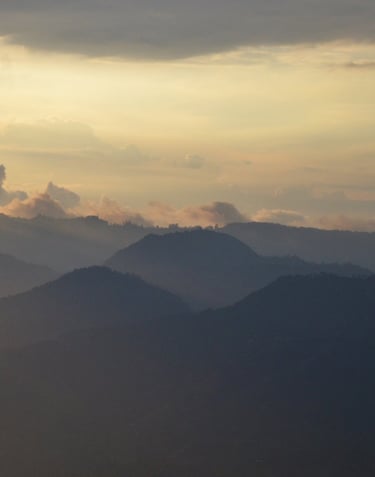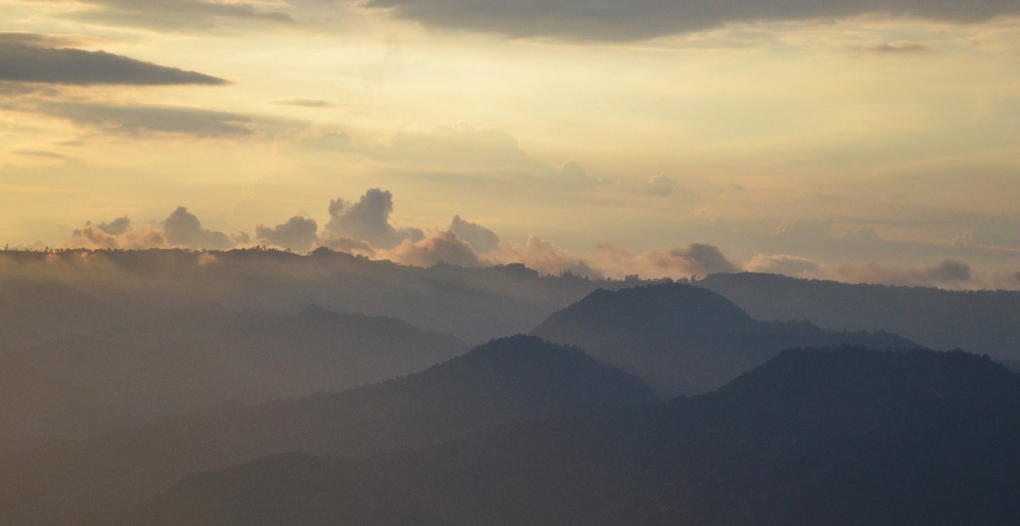 Desde una ladera de la cordillera oriental de los Andes colombianos, nuestra finca mira hacia el atardecer.
