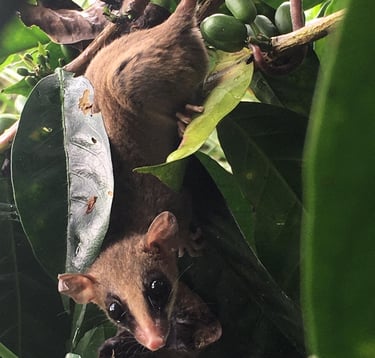 Hemos tenido la dicha de registrar marsupiales en nuestra finca: las conocidas zarigüeyas (faras o runchos) siempre cargando sus crías, y este más esquivo y pequeño ejemplar de la "martica", que nos mira con tanta curiosidad como nosotros a ella. La foto de este raro encuentro se dio durante la recolección del café; los granos verdes nos indican su diminuto tamaño. ¡Esperamos volverla a ver pronto!