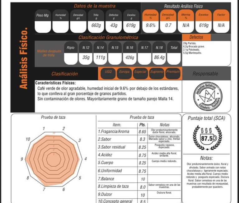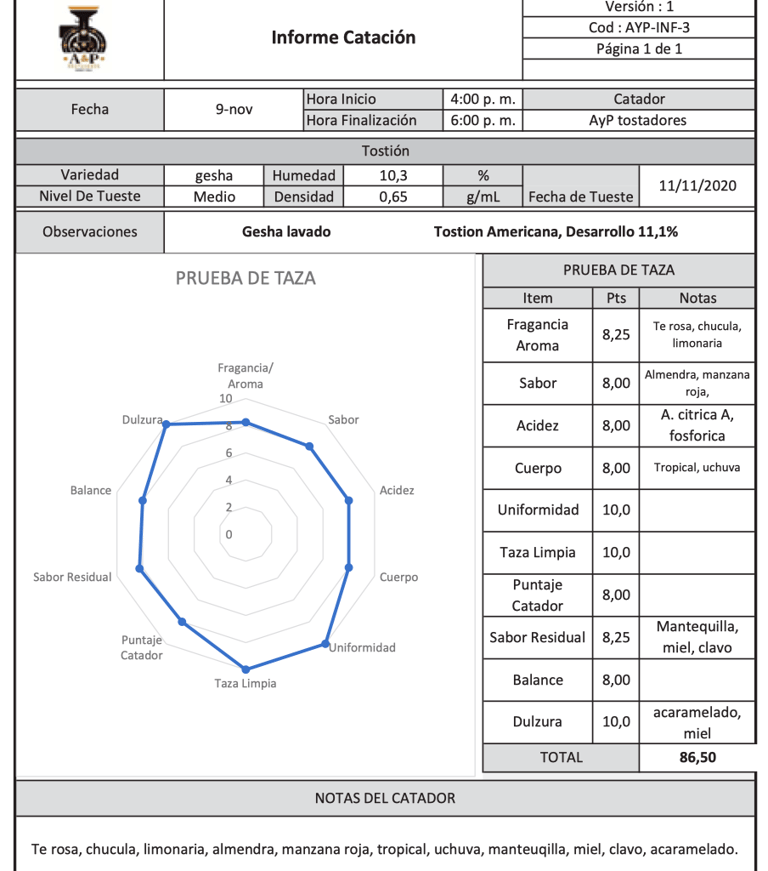 Floral, té de rosas, dulzura miel, albaricoque, herbal sutil, cuerpo ligero, jugoso, posgusto prolongado acidez cítrica (tangelo, toronja).