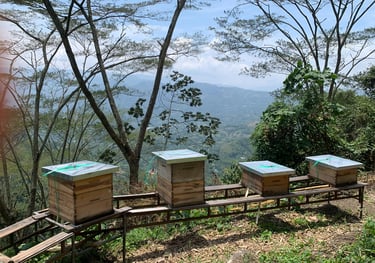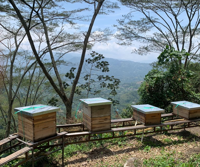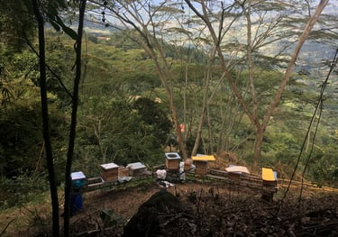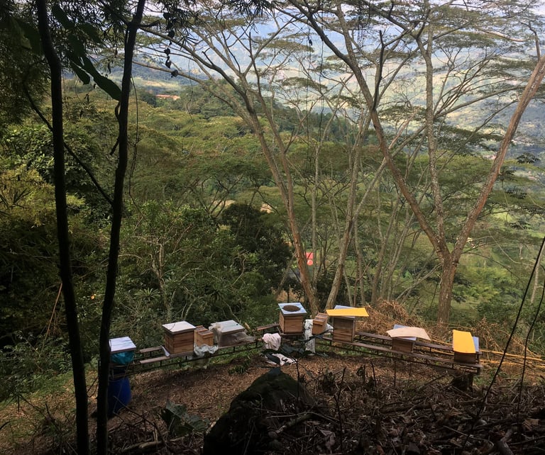 Una vista impresionante sobre las tierras más bajas y el sol tamizado por el vibrante sombrío de los galapos. Rodeadas por bosques y guaduales en una abrupta montaña, estas seis colmenas salen a recolectar su alimento a más de dos kilómetros a la redonda.