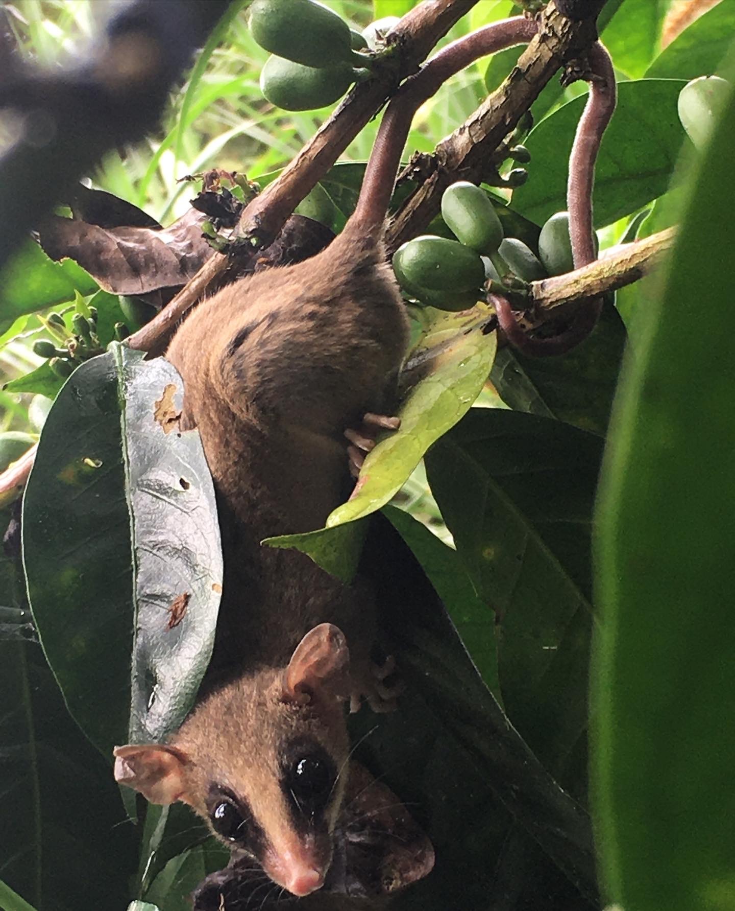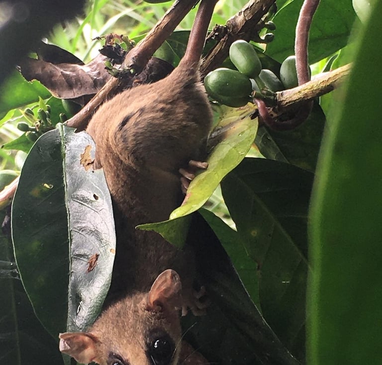 Hemos tenido la dicha de registrar marsupiales en nuestra finca: las conocidas zarigüeyas (faras o runchos) siempre cargando sus crías, y este más esquivo y pequeño ejemplar de la "martica", que nos mira con tanta curiosidad como nosotros a ella. La foto de este raro encuentro se dio durante la recolección del café; los granos verdes nos indican su diminuto tamaño. ¡Esperamos volverla a ver pronto!