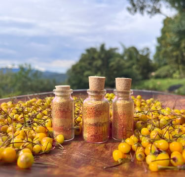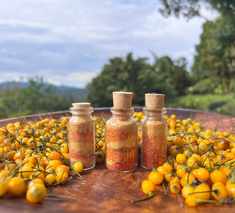 Las mezclas del valorado y exótico ají Charapita del Amazonas con variedades de habaneros generan esta topografía de los sabores y el picante de ajís secos al sol o al horno.
